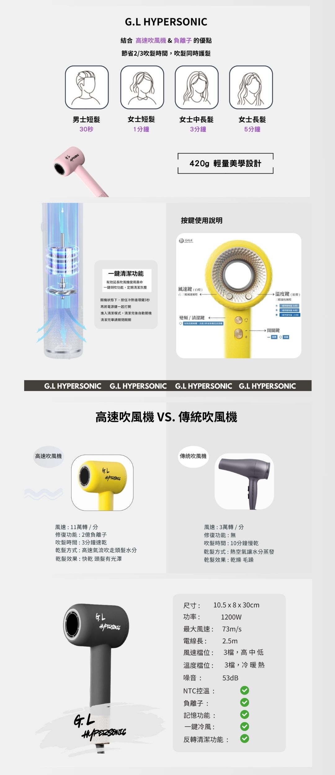 名稱:G.L HYPERSONIC吉樂無葉高速負離子吹風機(灰色/粉色/黃色)