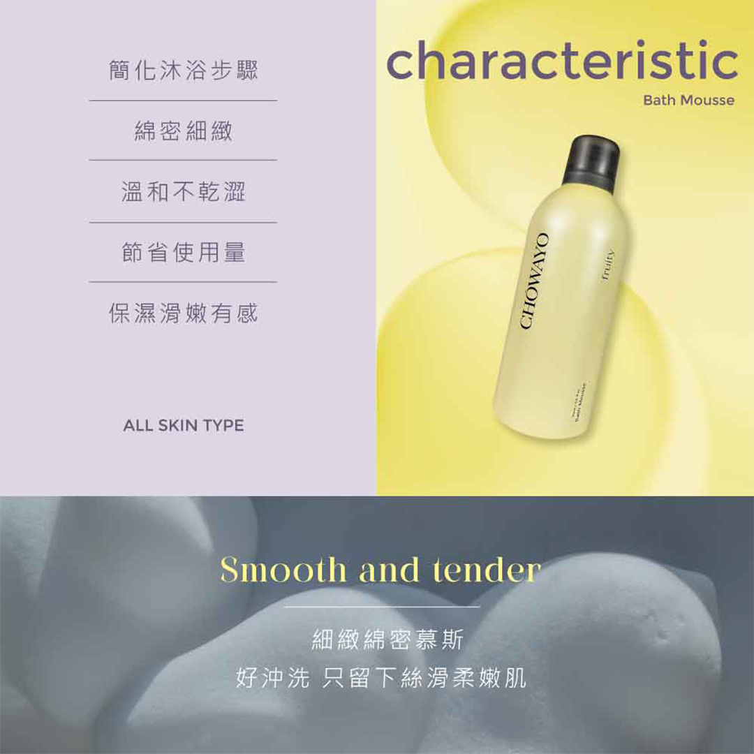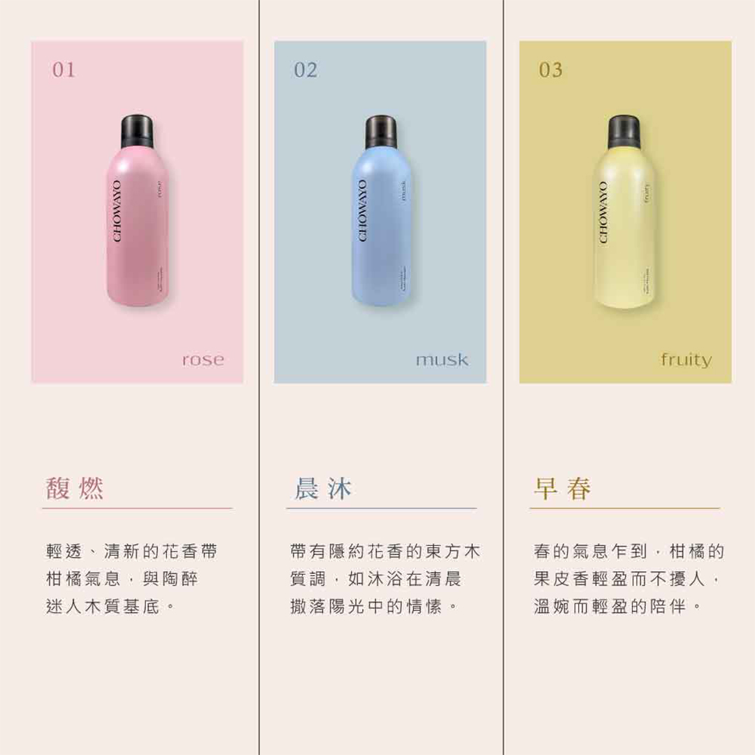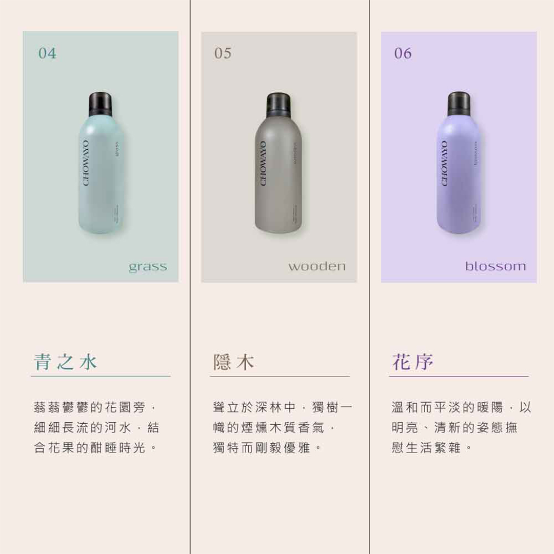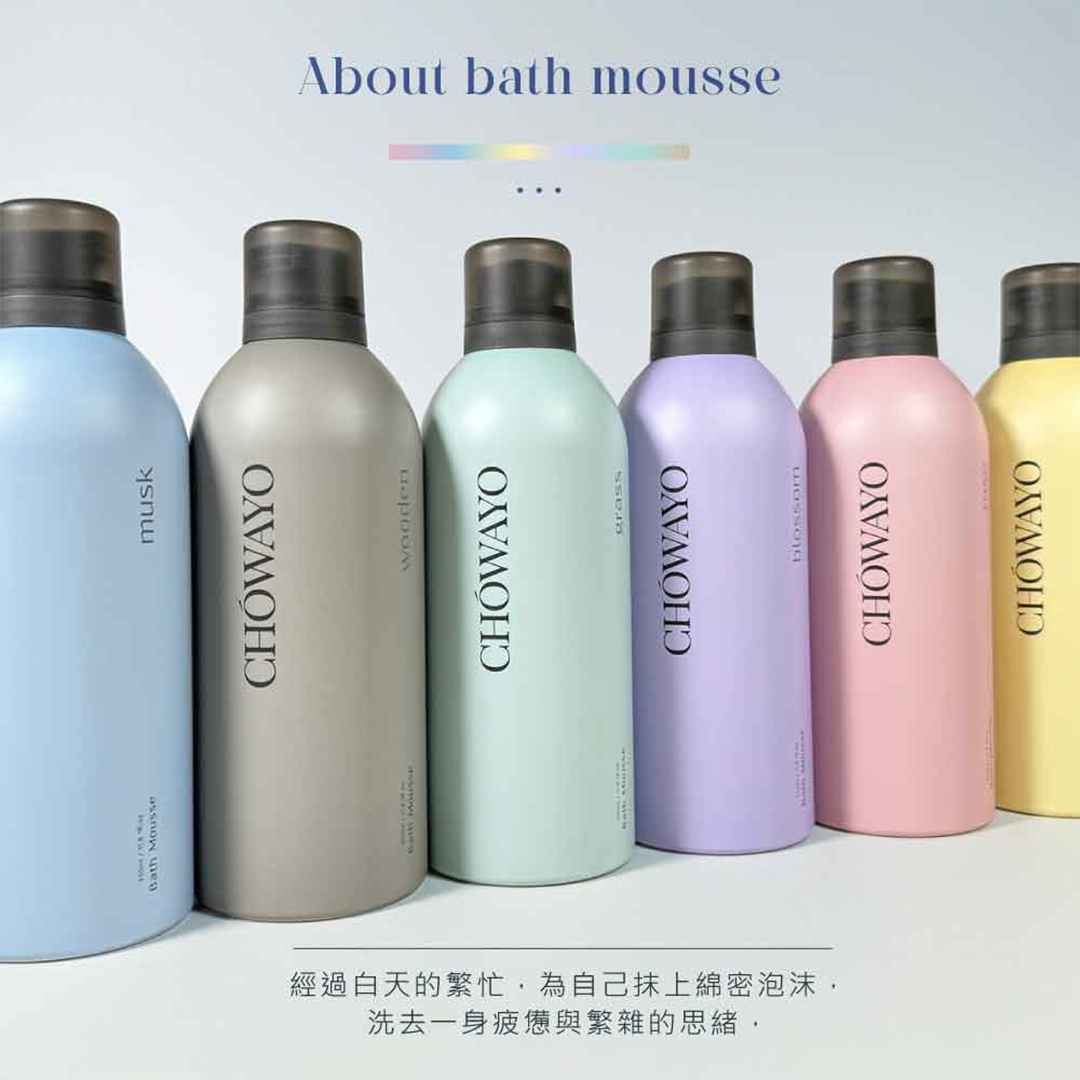 名稱:CHOWAYO沐浴慕斯(清之水/馥燃/花序/晨沐/隱木/早春)