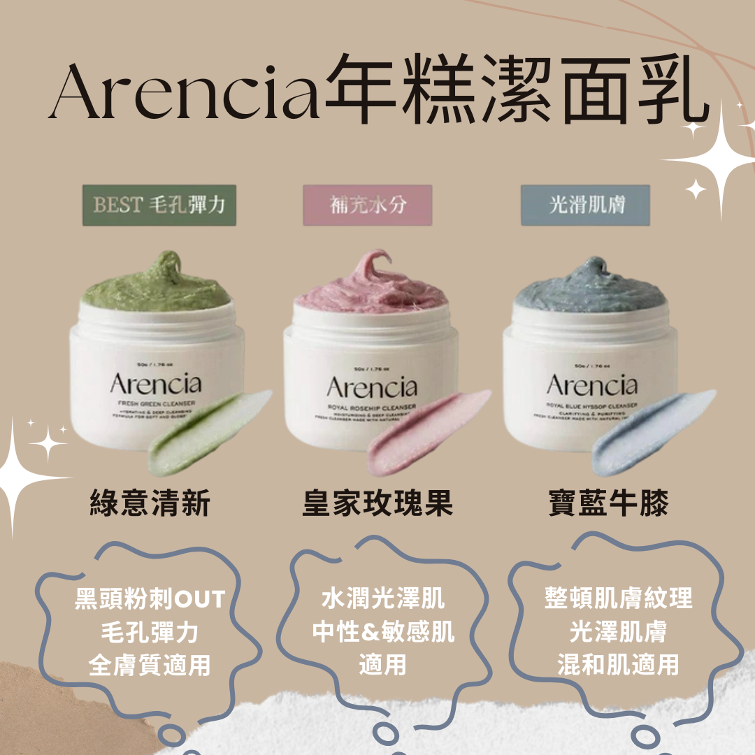 名稱:Arencia年糕潔面乳-綠意清新(綠)/皇家玫瑰果(粉)/寶藍牛膝草(藍)