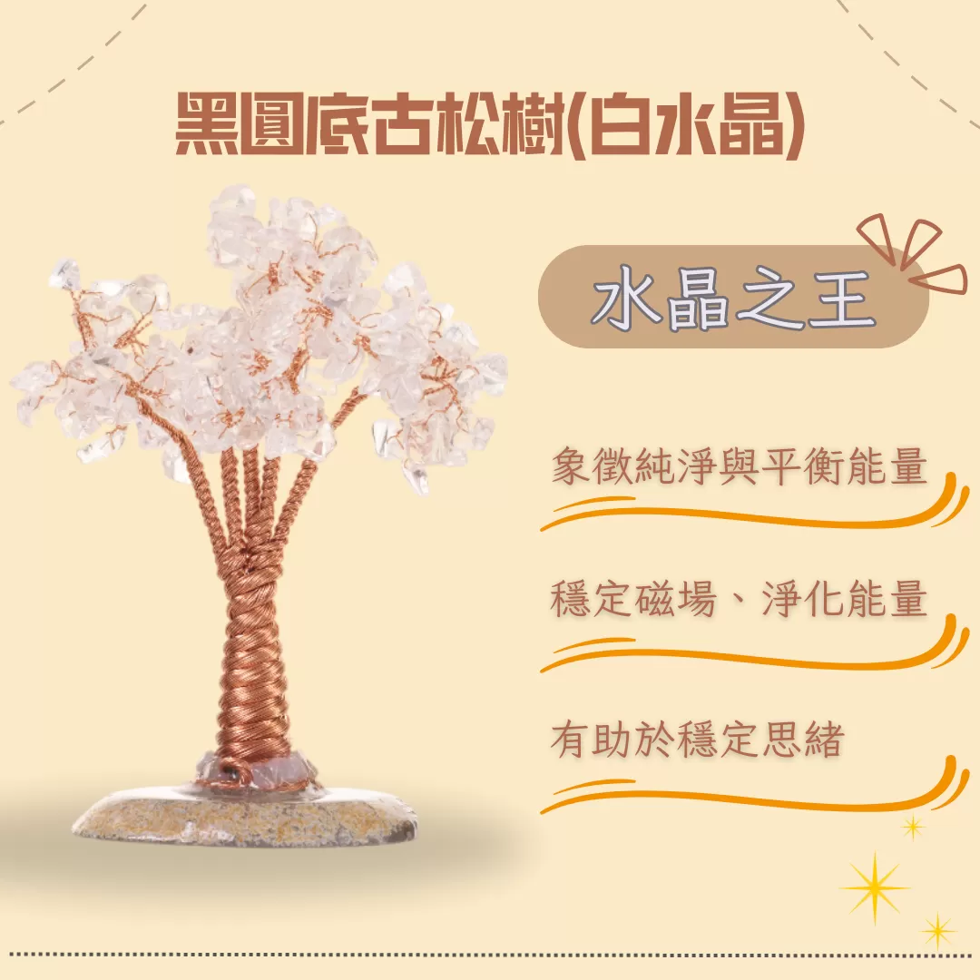 商品介紹:「松」象徵長壽與堅韌不拔,古松造型寓意事業基業長青、地位穩如泰山。結合「水晶之王」白水晶的純淨能量,能淨化空間磁場、提升專注力並平衡身心。黑圓底座則代表「水氣聚財」,與白水晶相生相旺,寓意正氣招財、驅邪避凶,為您打造清透澄淨的開運氣場,守護家宅平安順遂。