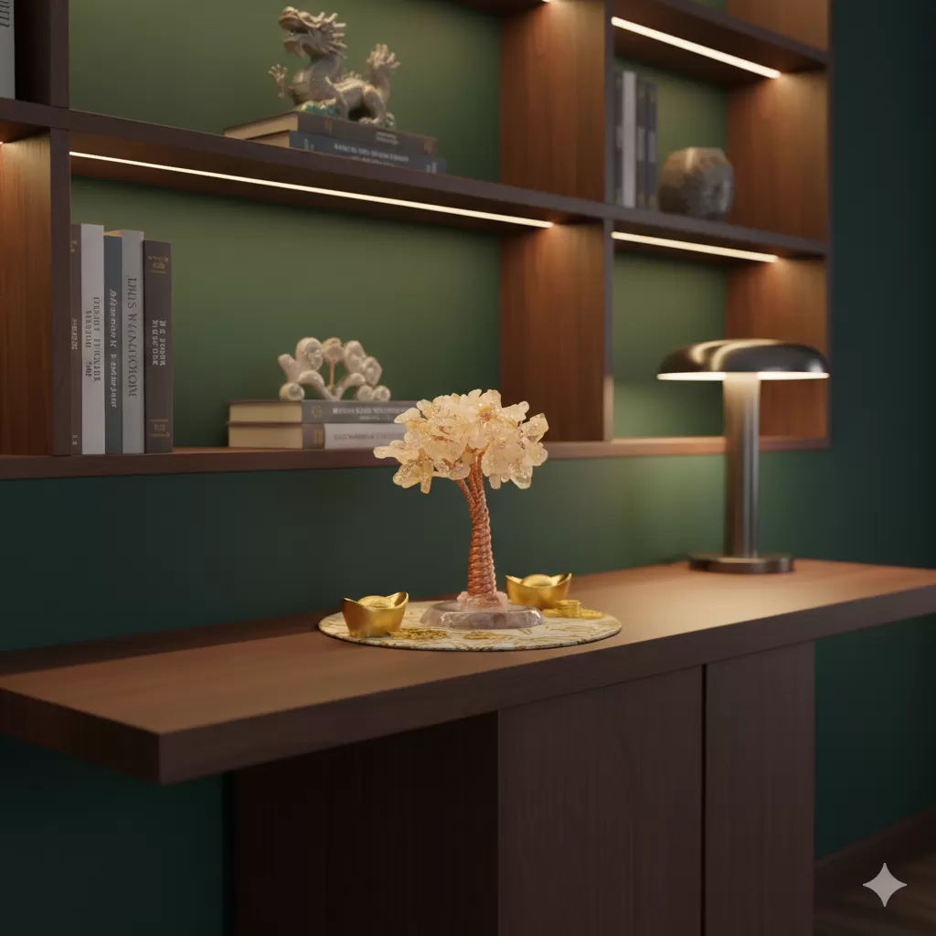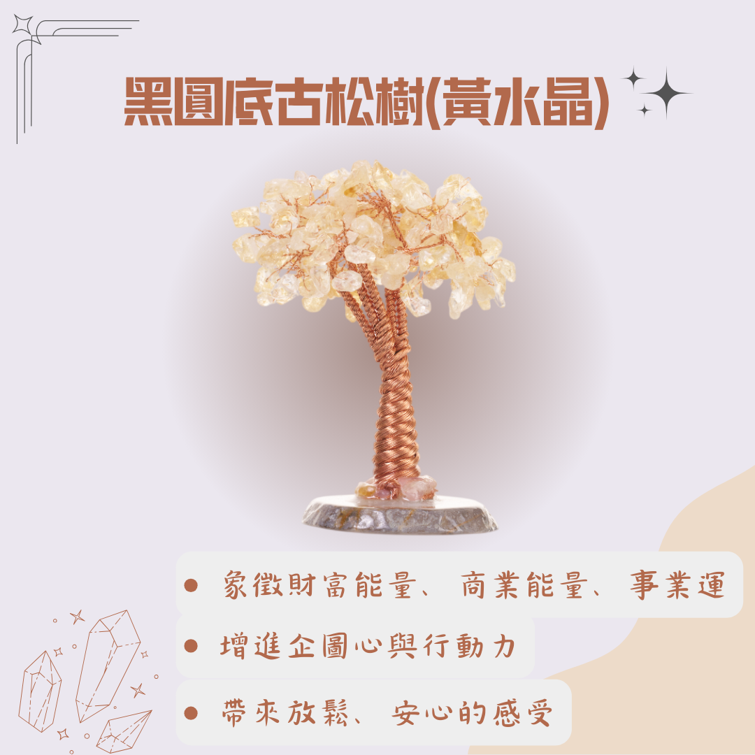 商品介紹:「松」在傳統文化中象徵長青與堅毅,代表事業基業長青、根深蒂固;黃水晶則被譽為「財富之石」,主招偏財與聚財能量。圓底古松樹結合穩重底座與招財晶石,寓意根深穩財、富貴長久,能為您穩固財庫氣場,助事業如松木般繁茂。