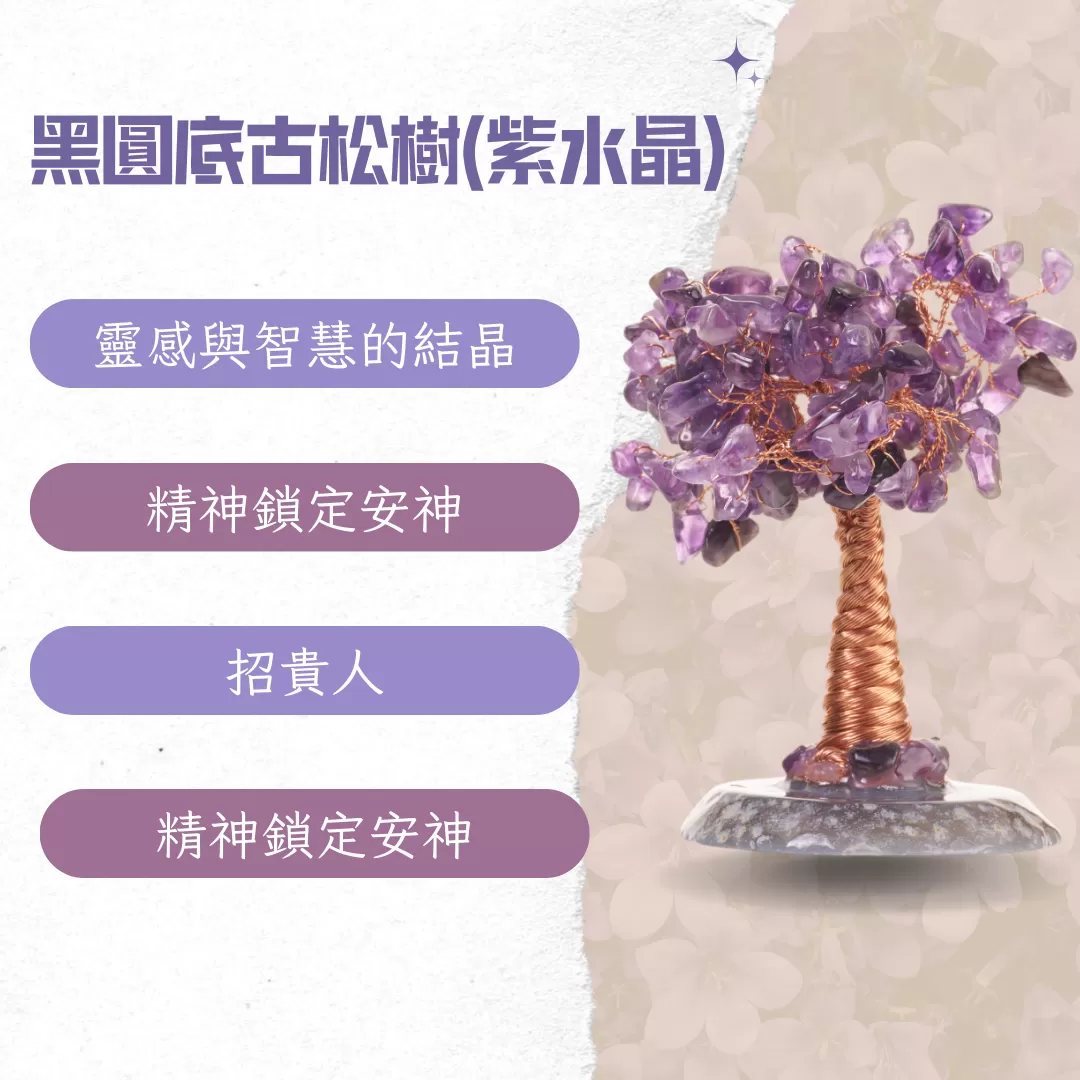 商品介紹:古松樹象徵長壽、穩固與根基深厚,寓意事業長青、財運穩定累積;紫水晶自古被視為「智慧與貴人之石」,具有聚財、招貴人、安定心神與提升整體氣場的能量。黑色圓底代表沉穩守財、化煞擋厄,使財氣不外漏。