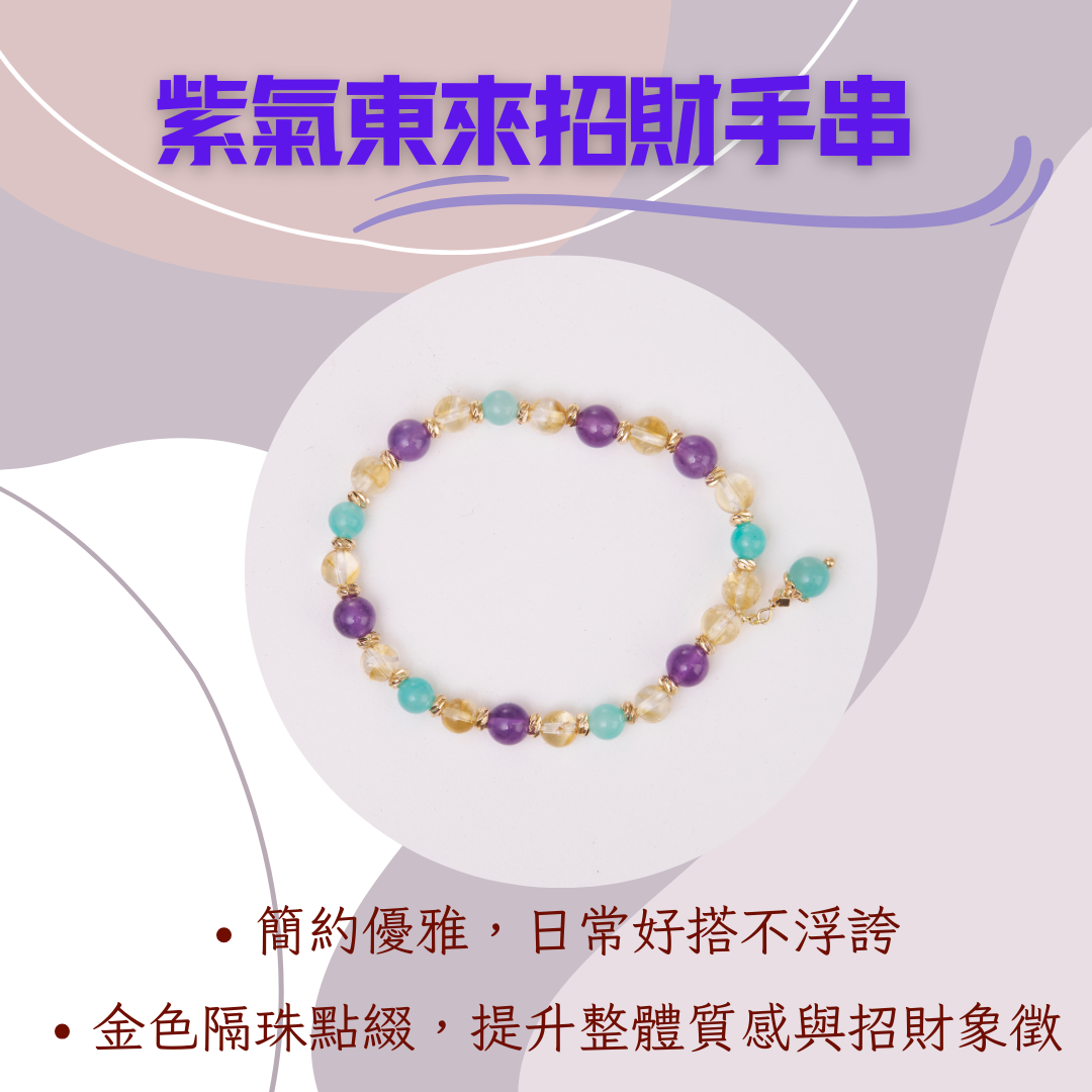 商品介紹:紫氣東來招財手串結合貴人、財富與流動能量,寓意財運漸旺、好運到來、機會不請自來,適合日常配戴或作為祝福送禮,為生活帶來穩定而持續的好運氣場。