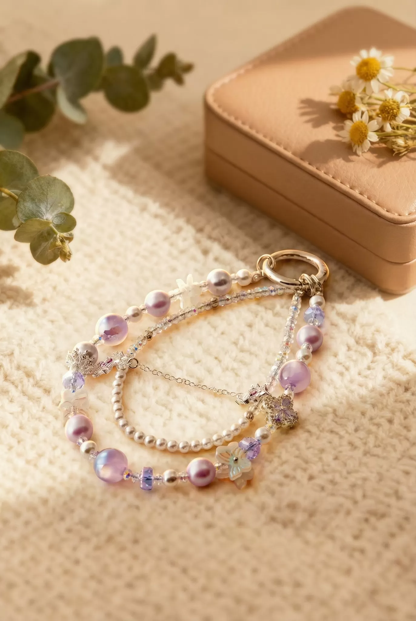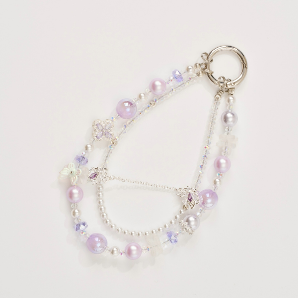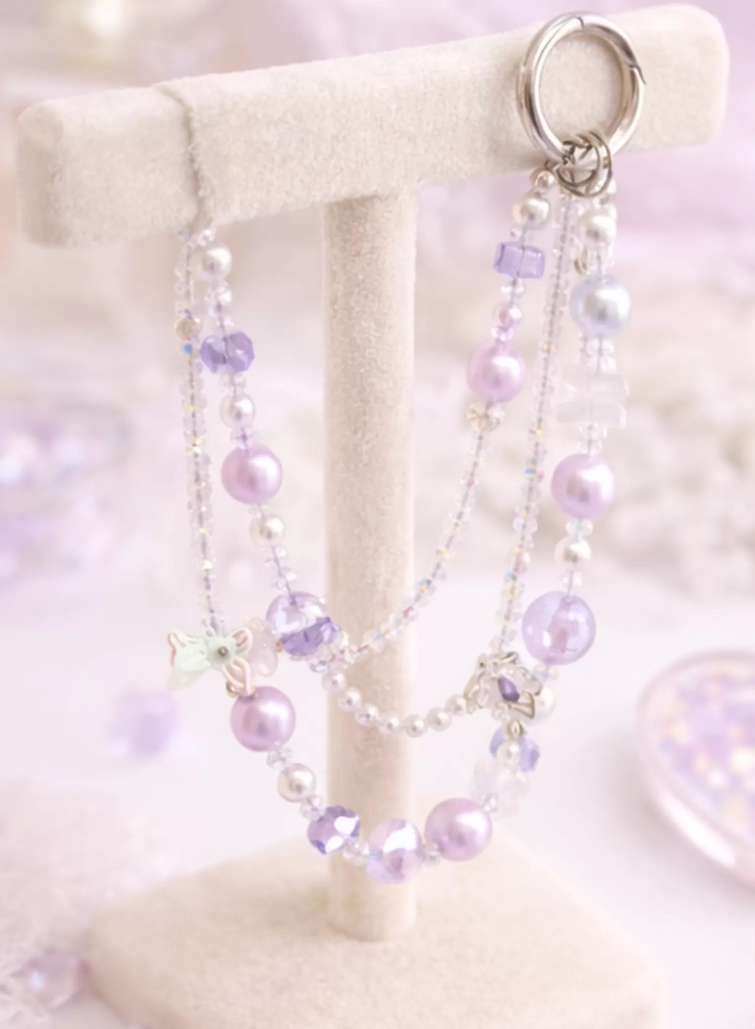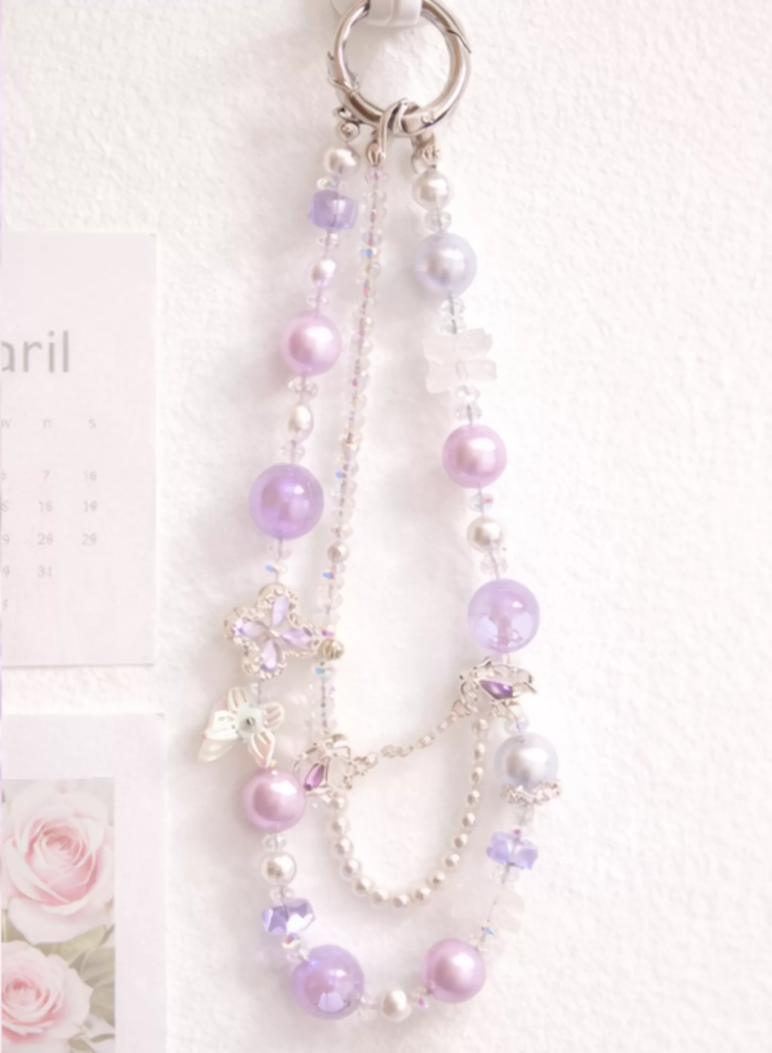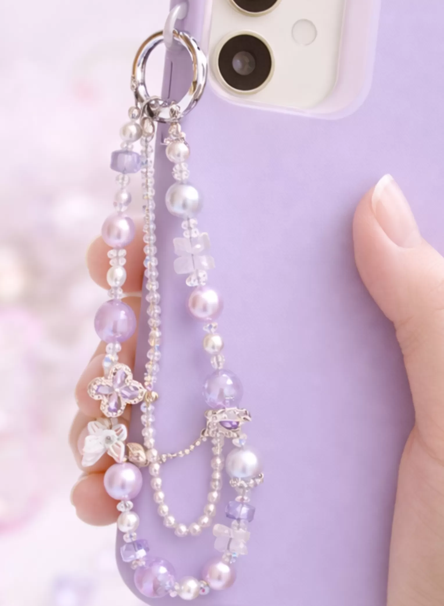 商品介紹:以溫潤的薰衣草紫珍珠交織晶透的幸運草飾件,營造出充滿夢幻感的「優雅小仙女風」!細膩的雙層珠串結構搭配銀色金屬鏈條,不僅是精緻女孩點亮手機殼的吸睛亮點,更能輕巧變身為時尚包包掛飾或高質感鑰匙圈,在拿取物品的每個瞬間,都散發著如同置身神祕星系般的浪漫與療癒能量!