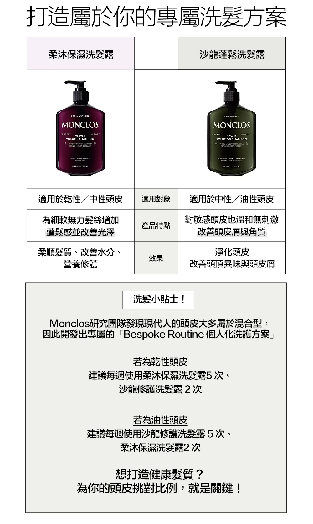 名稱:MONCLOS沙龍蓬鬆洗髮露/柔沐保濕洗髮露