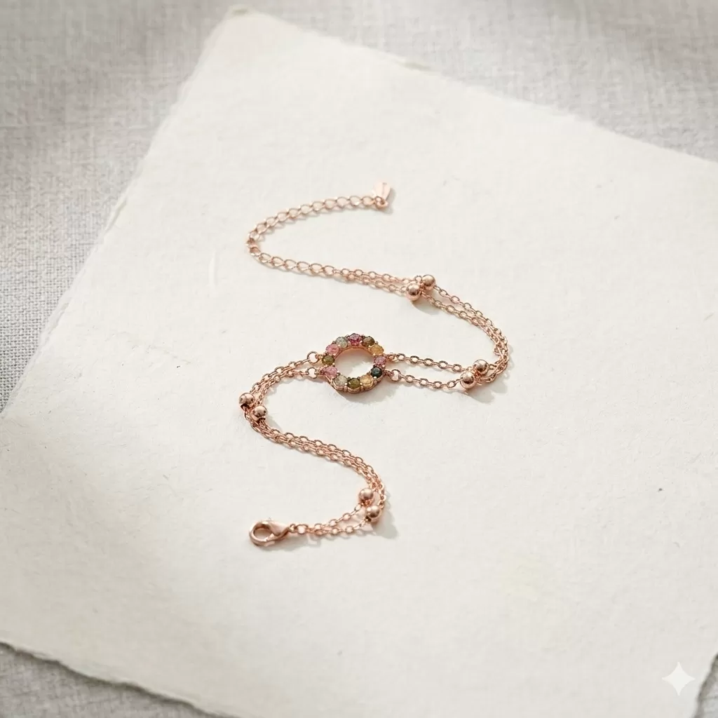 商品介紹:以細緻玫瑰金雙鍊設計,搭配中央七彩寶石圓環,在低調優雅中融入繽紛色彩,讓手腕多一份細節亮點。