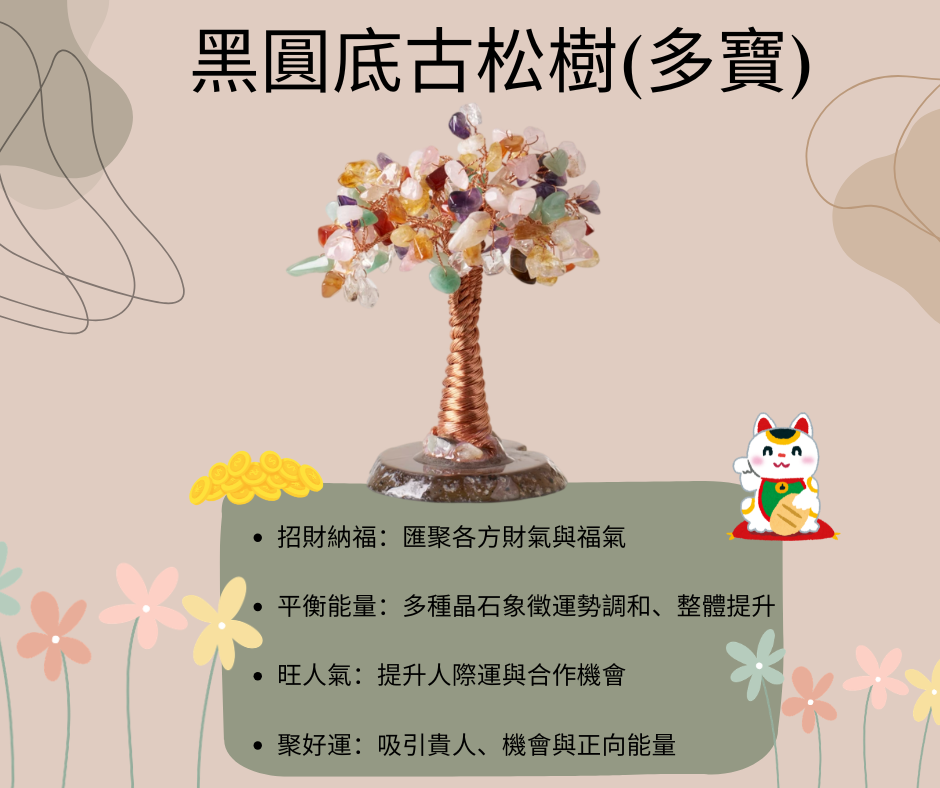 商品介紹:「松」在傳統文化中象徵長青與堅毅,寓意事業穩固、根基深厚;多寶晶石則象徵匯聚多種能量,代表納福聚財、好運相隨。黑圓底古松樹結合沉穩底座與多彩寶石,如同聚寶之樹,寓意福氣匯集、財運綿延,為空間增添祥瑞氣場,象徵基業長青、富足安穩。