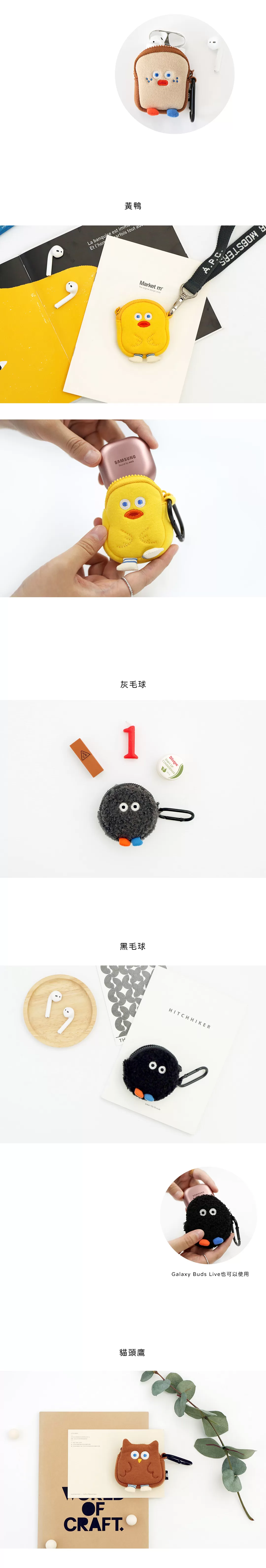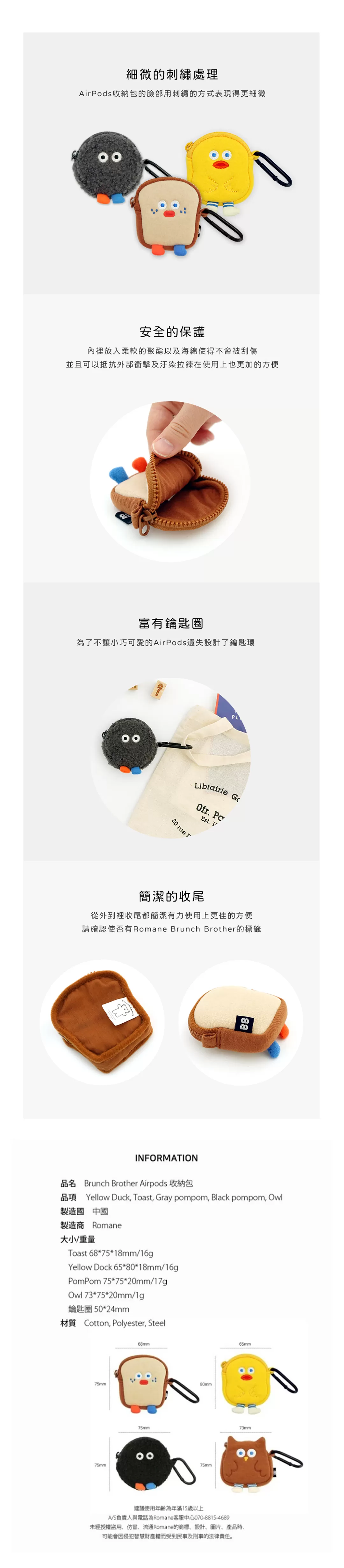 尺寸:小黃鴨6.5x8公分/吐司6.8x7.5公分/貓頭鷹7.3x7.5公分/小毛球(灰、黑)7.3x7.5公分